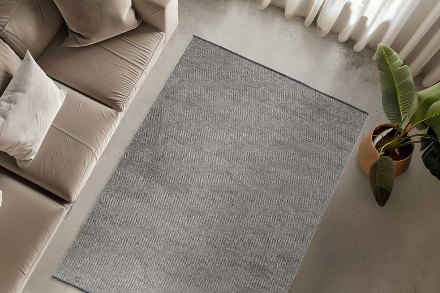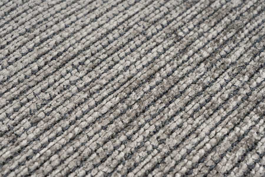 Moderní kusový koberec, z velmi jemného polyesterového vlákna. Příčně pruhovaný vzor, s krátkými třásněmi.