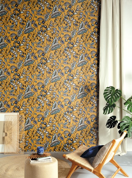 Přírodní motivy, tlumené barvy na okrovém podkladu.