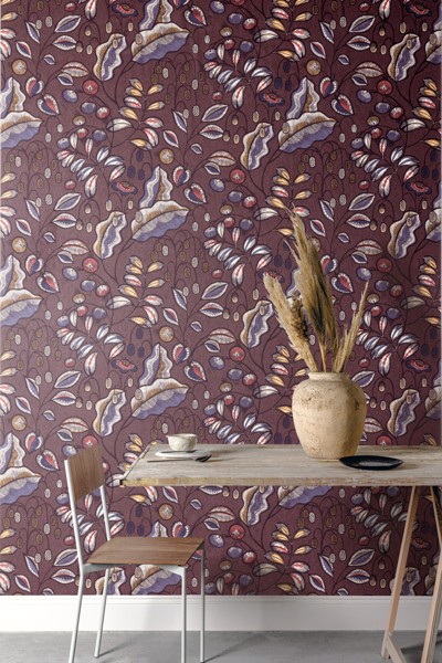 Přírodní motivy, tlumené barvy na hnědém podkladu.