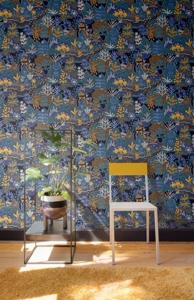 Kresba přírodní scenérie, tlumené barvy na černém podkladu.