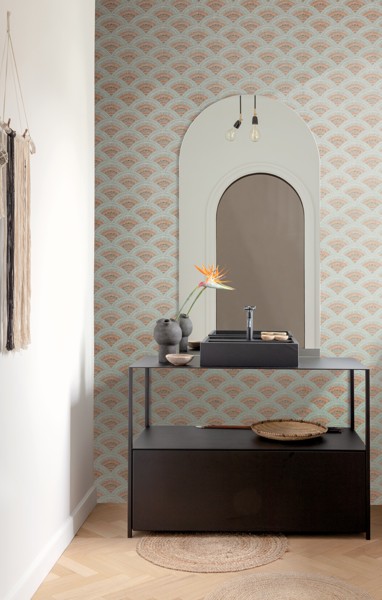 Výseky kruhů, modrá perleť na béžovém podkladu.