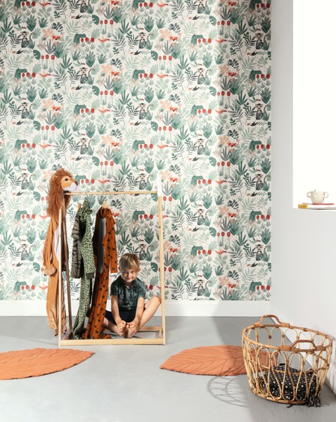 Wilderness, džungle s malovanými zvířátky, zelené odstíny s oranžovou na béžovém podkladu.