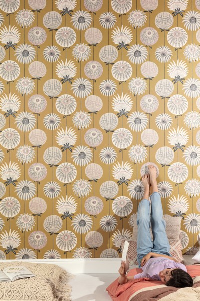 Balloon, květiny ve tvaru hravých balónů. Teplé barvy, modré a růžové detaily, žlutý podklad.