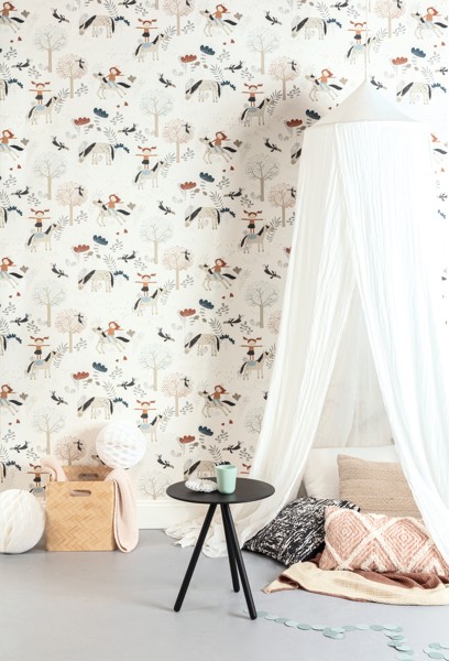 Pony, malované kamarádky z béžového lesa a poník, tlumené barvy, krémový podklad.