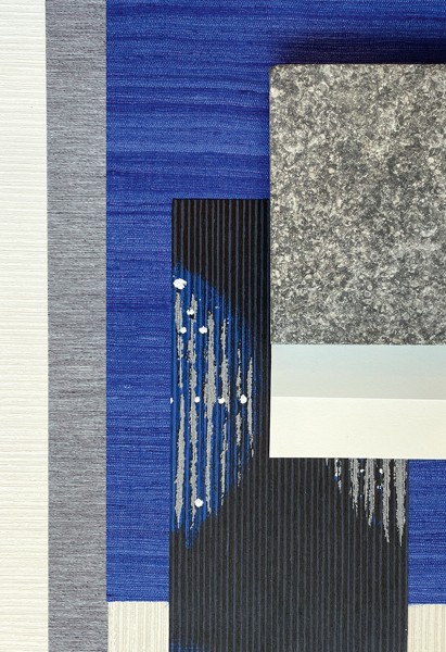 Akono, netkaná textilní tapeta, geometrické potisky v pruzích, modrá na pruhovaném tmavě šedém podkladu, 100 % viskóza.