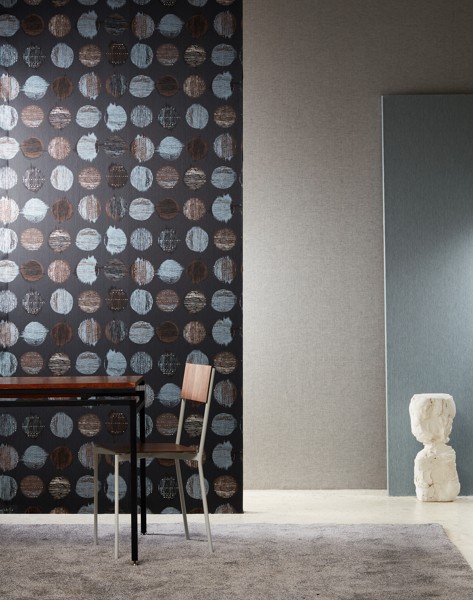 Farro, netkaná textilní tapeta, rozpité barevné kruhy, stříbrná a hnědá na tmavě modrém pruhovaném podkladu, 100 % viskóza.