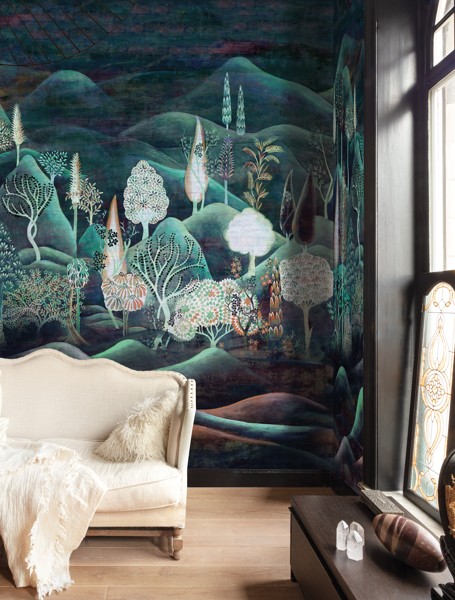 Munnar, digitálně potištěný panel na sisalovém podkladu s motivem malované indické krajiny. Černý podklad v kombinaci s zelenými detaily. Panel B.