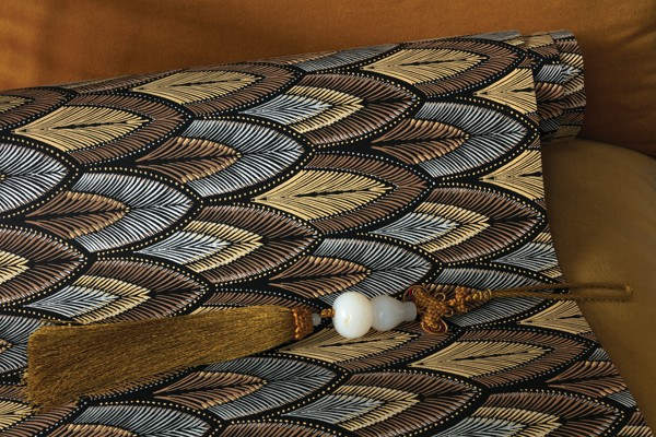 Dabu, stylizovaná kresba peří. Obrysy ve žlutých tónech se stříbrnými detaily na černém podkladu.