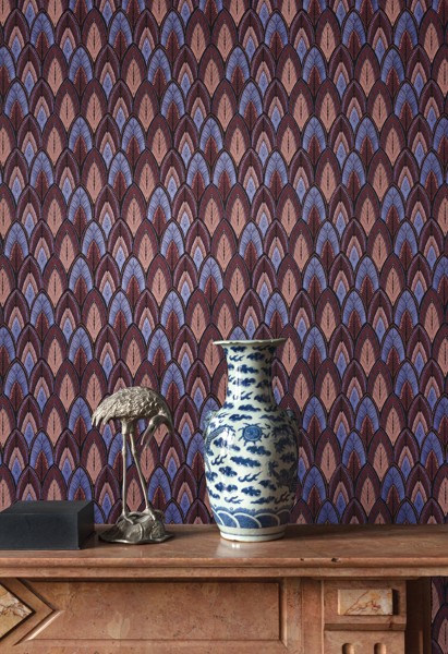 Dabu, stylizovaná kresba peří. Růžové odstíny, hnědá a fialová třpyt na černém podkladu.