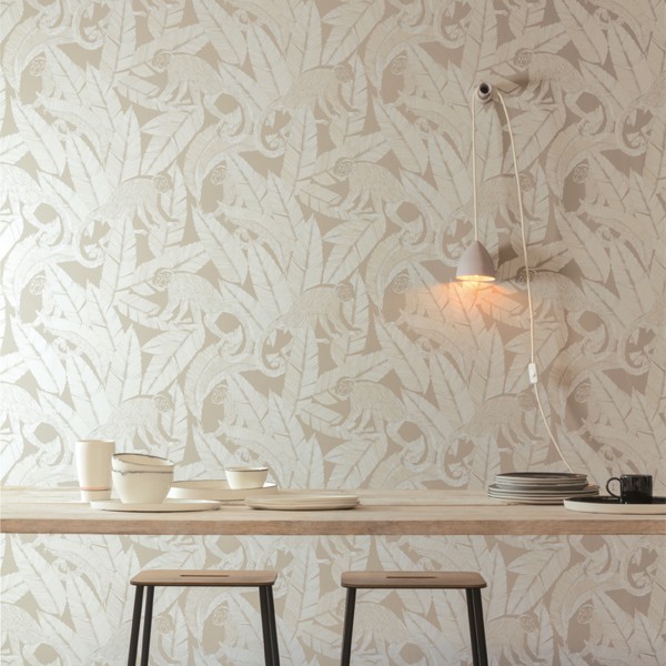 Opice a listí z džungle složené z bílých čárek, místy s lesklým finišem na béžovém pozadí.