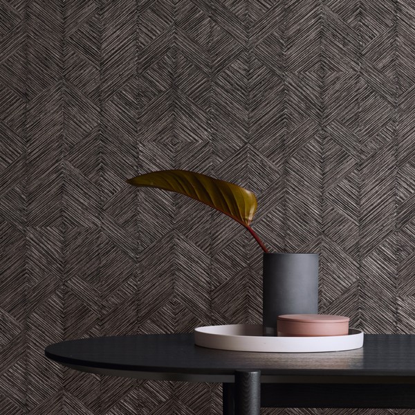 Textura vytvořená z jednotlivých, černých a platinově lesklých čárek na hnědém pozadí.
