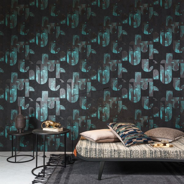 Zelené, lehce lesklé masky na černém strukturovaném pozadí.