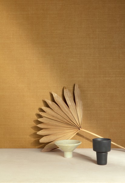 Minna, hladká jednobarevná tapeta s jemnými tečkami, hořčicový podklad, zlaté detaily.