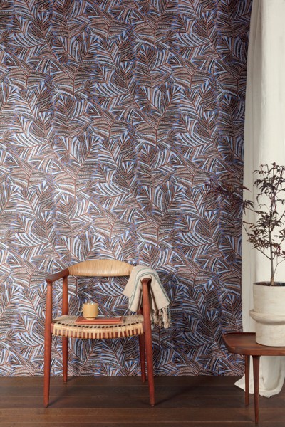 Papunya, schematické znázornění hravých rostlin, fialová a modrý obrys, hnědý podklad.