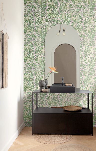 Papunya, schematické znázornění hravých rostlin, zelená a růžový obrys, béžový podklad.