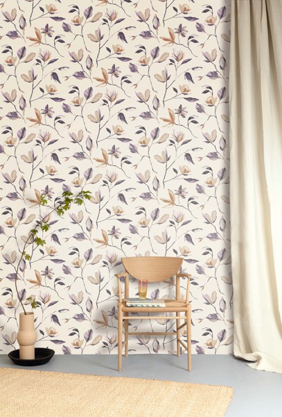 Blooming, jemné malované květiny, smetanový podklad, fialové a bronzové květy.