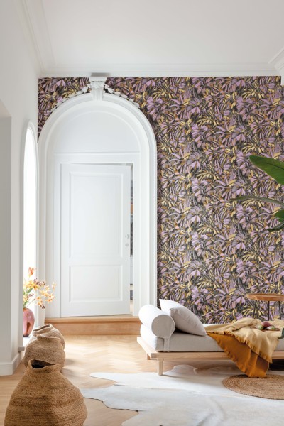 Bonita, barevné tropické listy ve žluté a fialové, hnědý podklad, detaily v lesku.